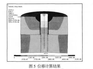 重点关注被连接零件的变形,尤其是内螺纹零件的变形。从图5中可以看出,螺纹连接件中心近螺纹处的位移最大,从计算结果中提取螺纹连接件的最大位移,为0.16μm。由于被连接件外缘彼此产生脱离,分别提取两个被连接件外缘接触点的位移,进行相减可得对应的脱离距离。从提取结果可以看出,被连接件在X和Y方向均发生错位与脱离现象,其中,X方向最大脱离0.014μm,Y方向最大脱离0.033μm。
