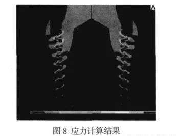 将螺纹连接接触配合部分的应力计算结果放大显示,如图8所示。从图8中可以看出,螺纹的拧入的前几个牙型彼此之间产生比较大的应力和变形,有比较大的应力集中,而其余的螺纹牙型则对螺纹拉力的贡献较小。