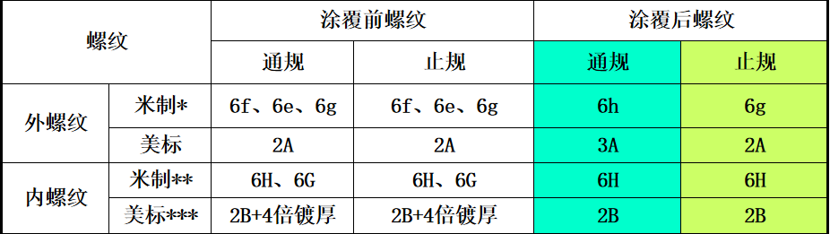 ASTM F1941-2015《紧固件电镀》标准第6.3.1.2:“有镀层的英寸外螺纹必须能接受3A级通规,有镀层的公制外螺纹必须能接受h级(6h或4h)通规。止规与镀前一样。”