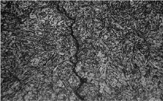 2.微观分析:异常冶金夹杂,裂纹形貌呈锯齿状延伸;用4%的硝酸酒精腐蚀后观察,没有脱碳现象,微观形貌见下图: