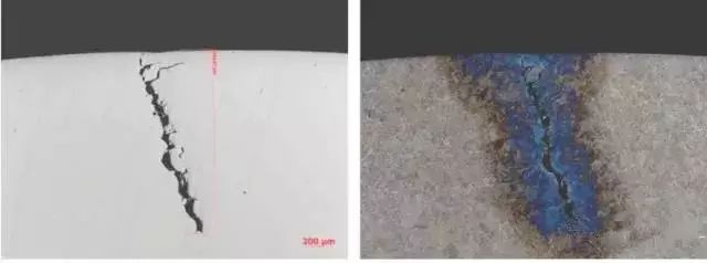 分析结论:存在脱碳的裂纹要分辨是否是原材料裂纹,一般裂纹脱碳深度大于等于表面脱碳深度的为原材料裂纹,裂纹脱碳深度小于表面脱碳深度的锻造裂纹。