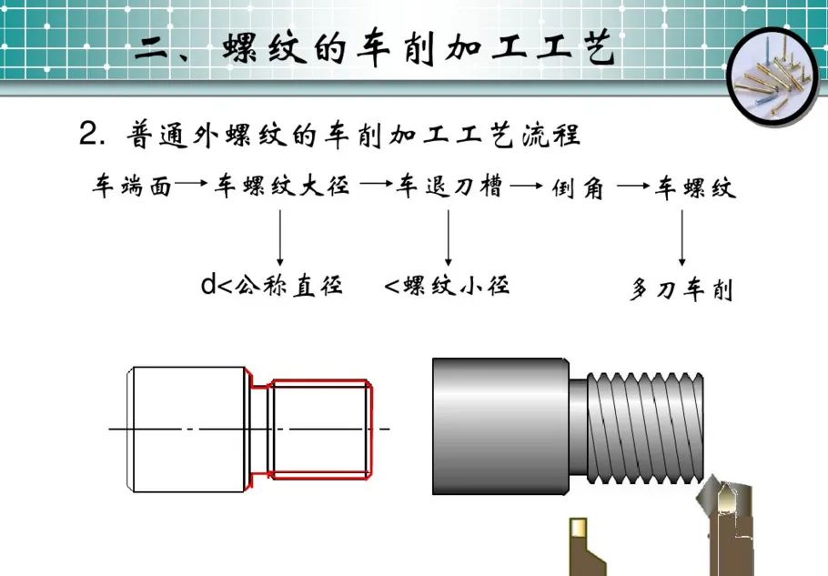 什么是矩形螺纹 螺纹的种类: 螺纹的种类氛围联接和传动,其中又有细分,矩形螺纹是传动的其中一种。 矩形螺纹:螺纹牙型为正方形,螺纹牙厚等于螺距的1/2。传动效率高,但对中精度低,牙根强度弱。矩形螺纹精确制造较为困难,螺旋副磨损后的间隙难以补偿或修复。 身边最近的例子就是台虎钳的螺纹。需要整天拧紧、松开,紧固时要求很大的力。阀门水管之类的螺纹无论大小(小的是水管龙头),都是矩形螺纹,仅是尺寸略有不同而己。千斤顶和螺旋冲压机等也是使用这样的螺纹。因此,对矩形螺纹适用于大载荷,即要求距形螺纹可以强大,对螺纹的精度没有更多的要求。 螺纹切削加工工艺 1.切削原理: 车床主轴与刀具之间必须保持严格的运动关系:即主轴(工件)每旋转一周,刀具均匀地移动一个导程的距离。 2.车削加工工艺流程: 3. 矩形螺纹没有其他螺纹那样固定的牙型: 一般没有指定牙型尺寸时,就把螺纹牙的断面做成正方形。车刀直线进给加工矩形螺纹,按沟槽的深度(牙的高度)尺寸加工就行了。 车削刀具 矩形螺纹车刀: 螺纹车刀:从螺纹牙的形状考虑,车槽车刀适用于加工短的螺纹。只是刀的刃宽要是螺距的一半,同时因为螺距宽的螺纹较多,多使用高速钢弹性车刀。矩形螺纹加工最大的问题是车刀的研磨方法。 刃宽是螺距的一半即可,操作起来不容易。如螺距、导程增大,螺纹升角(导程角)就会大,车刀的后角会碰到螺纹牙的侧面。 另外注意,导程大的螺纹,螺纹牙顶和牙底的螺纹升角会不相同。所以,外圆周(螺纹牙顶)上,切削刃的宽度和沟槽宽一样,牙底沟槽上螺纹牙的下面会凹进去。为了避免出现这些现象,凹进去的部分使用车刀前刃宽度较小的梯形车刀。 车削矩形螺纹 在车削矩形螺纹时,要合理分配加工余量具体可以参考下图: 总结 矩形螺纹与三角形螺纹和梯形螺纹不同,矩形螺纹没有单面切削或双面切削的麻烦,也没有中径的问题,因为精度要求并不高。其实,这在螺纹加工里反而是比较简单的。