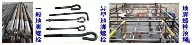 ③ 地脚螺栓:分为一般地脚螺栓、直角地脚螺栓、锤头螺栓和锚固地脚螺栓,一般地脚螺栓、直角地脚螺栓和锤头螺栓是在砼浇筑前预埋在基础之中,用以固定钢柱;锚固地脚螺栓是在已成型砼基础上经钻机成孔后,再安装、灌浆固定的一种地脚螺栓。