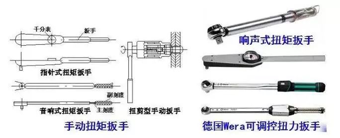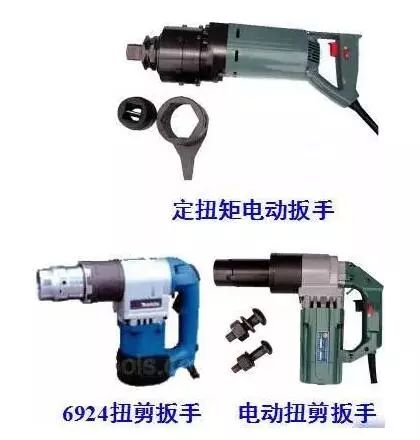 ① 手动扭矩扳手:高强螺栓以手动紧固时,要使用有示明扭矩值的扳手施拧,以达到高强螺栓连接副规定的扭矩和剪力值。常用的手动扭矩扳手有指针式、音响式和扭剪型三种。