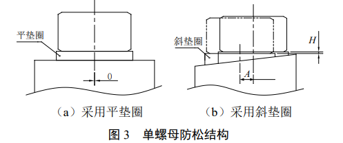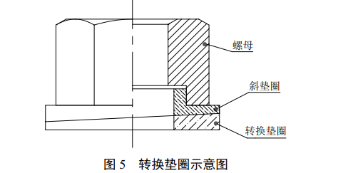 在实际安装过程中,一般情况下,被连接基体表面均为平面,采用斜垫圈时,螺母安装时会发生偏扭,为此需增加一个转换垫圈,使紧固装置实现平面连接的防松,如图5所示。