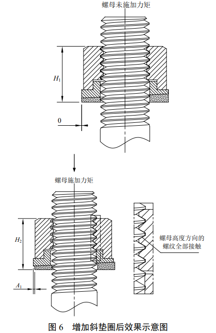 通过在单螺母下方增设斜垫圈,螺母与斜垫圈形成一体,螺母下行过程中受到斜垫圈径向挤压, 螺母产生一个径向位移 A1,螺纹副之间的接触点增多(图 6)。经验证,要消除M12-6g/6H螺纹副之间0.384mm的固有螺纹间隙,可将斜垫圈斜度设置为6,此时螺母只需下行0.04mm即可;当螺母继续下行时,螺纹副材料开始产生弹性变形, 摩擦力增加至最大状态。
