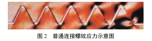 普通连接型式螺纹之间本身存在间隙,当紧固件安装后,实际只有2~3扣螺纹处于压紧状态, 其余大部分螺纹处于虚接状态,这部分螺纹不能提供足够的摩擦阻力来防止螺纹回退(图 2)。