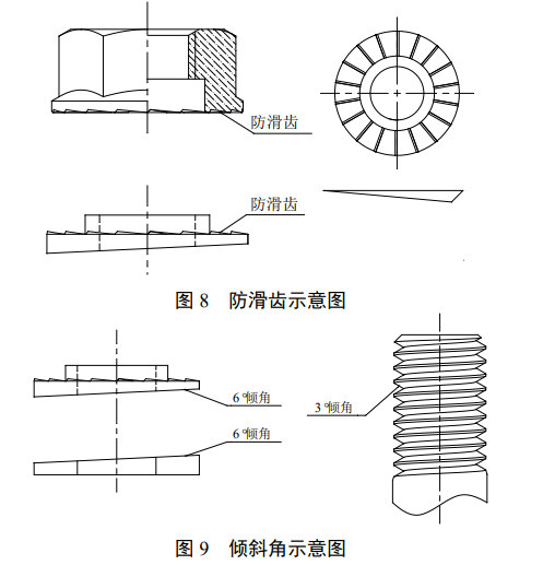 由于L1永远小于L2,故 F1>F2,即螺纹副之间摩擦力大于螺母与斜垫圈之间的摩擦力,滑动首先会发生在螺母和斜垫圈之间。当斜垫圈出现旋转趋势时,由于斜垫圈倾斜角度不小于6,而螺纹升角一般不大于3(图 9),斜垫圈旋转就会与转换垫圈发生锁死,因此斜垫圈不会松动,螺纹副也不会发生松动[3]。转换垫圈出现旋转趋势时,同理。