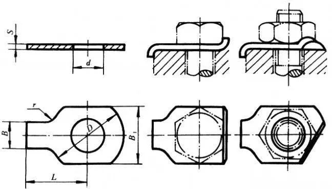 螺母拧紧后,将单耳或双耳止动垫圈分别向螺母和被联接件的侧面折弯贴紧,实现防松。