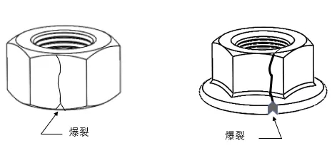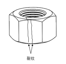 紧固件螺母是连接件的常见零件,对于紧固件螺母的使用来说,常见的表面缺陷问题有:裂缝(淬火裂缝、锻造裂缝和夹渣裂缝、全金属有效力矩型锁紧螺母的锁紧部分裂缝、螺母-垫圈组合件的垫圈座裂缝)、剪切爆裂、爆裂、裂纹、皱纹、凹痕、切痕和损伤等。下面针对紧固件螺母表面缺陷的一些问题进行详细讲解。