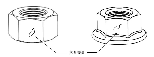 剪切爆裂的原因:在锻造过程中可能产生剪切爆裂,如在螺母的外表面或在法兰面螺母的周边上出现,通常剪切爆裂和螺母轴心线约成45°。