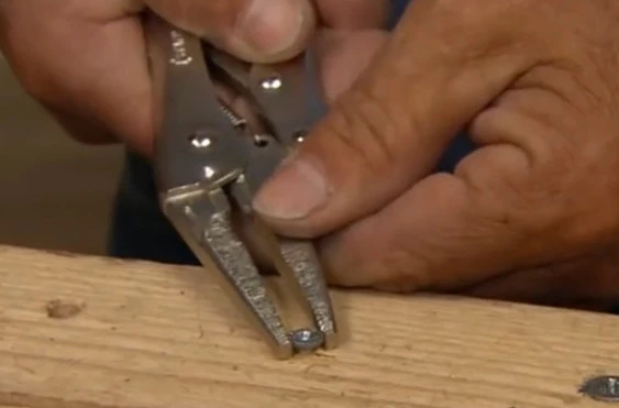 4、如果螺丝顶住的凹槽变形,无法借力拧出,我们可以用锤子和一字的螺丝刀在螺丝顶部打下去,凿成一个v形的凹槽,在延着螺丝旋出的方向打一下,最后就可以用钳子拔出来了。