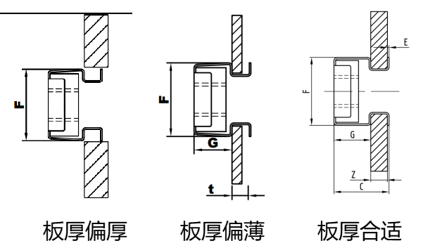 卡式螺母在选型时需特别注意,每一款卡式螺母都有其适用的板厚范围,选用时需要根据实际板厚选择合适的卡式螺母。当板厚大于设计厚度时,会出现卡不住装不上的情况,板厚小于设计厚度时,会发生不可控的松动。另外,大家在选用时也需要根据实际的开孔尺寸选择合适的卡式螺母。