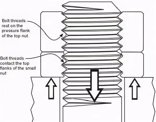1、双螺母双螺母防松也称对顶螺母防松,当两个对顶螺母拧紧后,两个对顶的螺母之间始终存在相互作用的压力,两螺母中有任何一个要转动都需要克服旋合螺纹之间的摩擦力。即使外载荷发生变化,对顶螺母之间的压力也一直存在,因此可以起到放松作用。