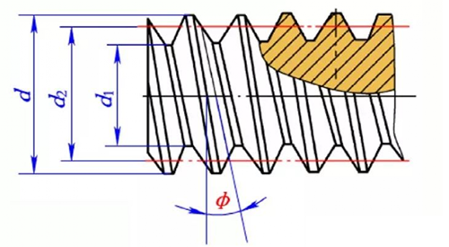 8、螺纹升角(导程角),中径圆柱上螺旋线的切线与垂直于螺纹轴线的平面之间的夹角。