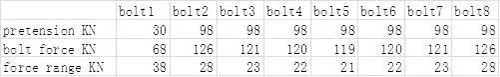 假定螺栓的预紧力为98KN,如果有一个螺栓松了,说明预紧力降低了,或者没有预紧力了,这里把螺栓1的预紧力设为30KN,比其他螺栓的预紧力少了68KN,在法兰承受0600KN交变拉力时,计算螺栓的受力及拉力变化范围:
