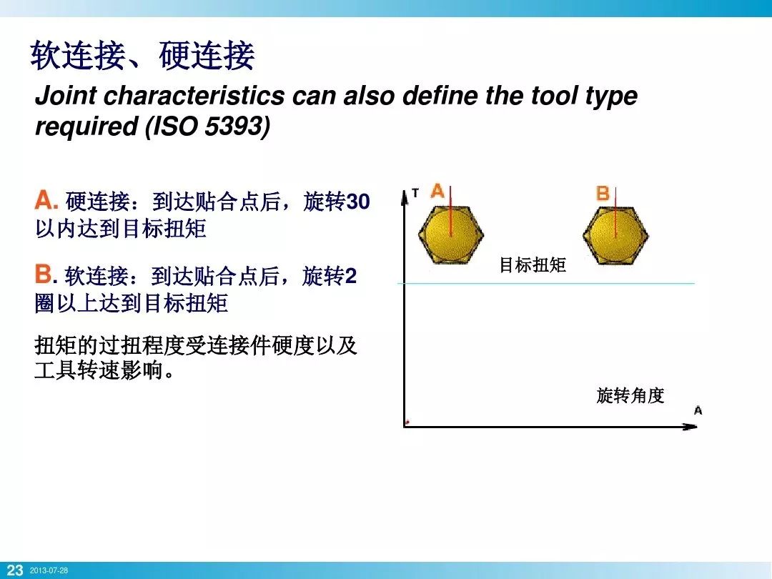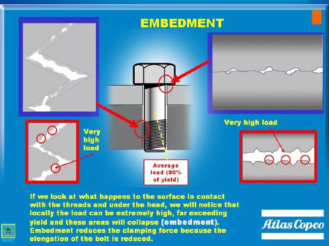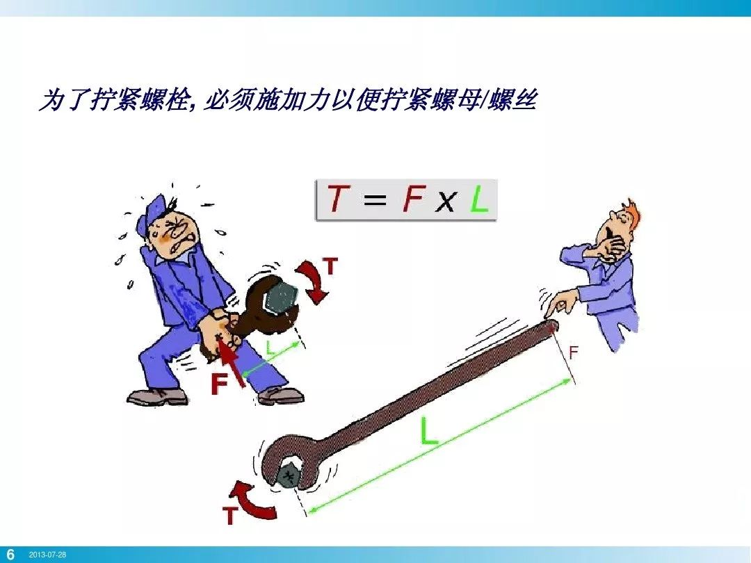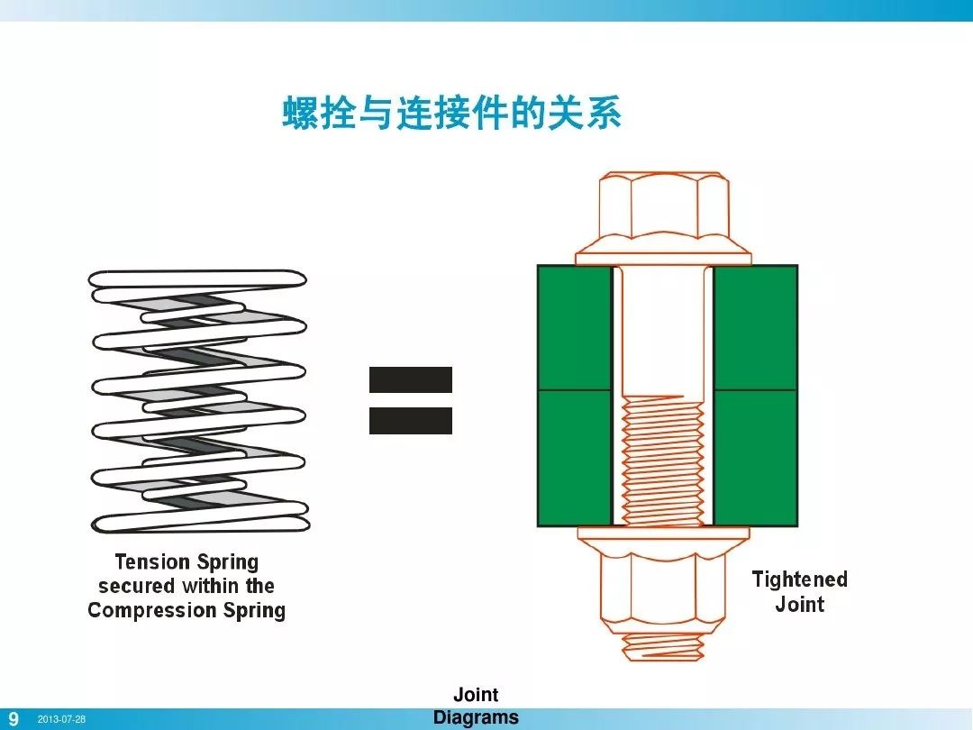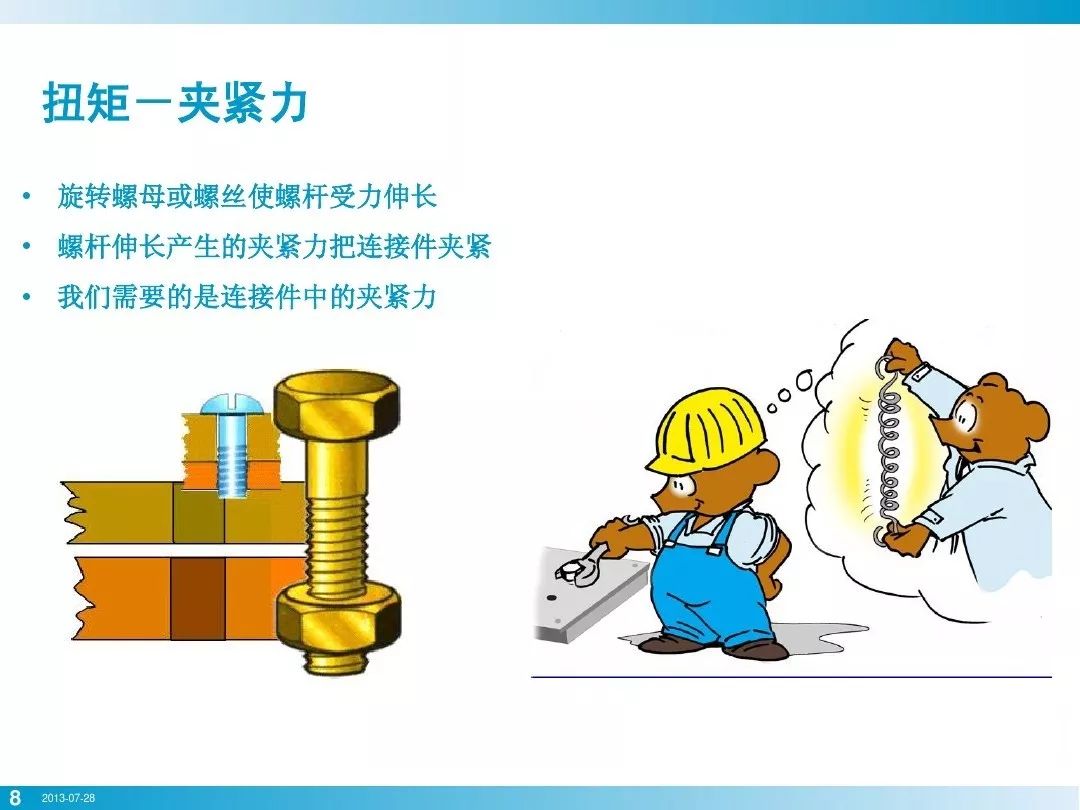螺栓:机械零件,配用螺母的圆柱形带螺纹的紧固件。由头部和螺杆(带有外螺纹的圆柱体)两部分组成的一类紧固件,需与螺母配合,用于紧固连接两个带有通孔的零件。这种连接形式称螺栓连接。如把螺母从螺栓上旋下,又可以使这两个零件分开,故螺栓连接是属于可拆卸连接。下面我们就来讲讲,关于螺栓拧紧技术!拧紧一颗螺栓,需要施加一定扭矩旋转一定角度后才可以完成,这部分的扭矩+角度所做功最终转为三个部分:• Fm= T/ (0.16P + (μg * 0.58 * d2) + ((Dkm/2) * μk))μg = 螺纹副摩擦系数friction value in threadDkm = 螺栓头表面尺寸 size of surface bolt (nut)-headμk = 螺栓头表面摩擦系数fricition value surface bolt-head一般而言,这三者的比例在10%,40%以及50%,这部分能量的消耗很容易直观的体会到:10%的夹紧力做功体现在螺栓的被拉伸,40%和50%体现了螺纹副以及螺栓头下拧紧后摩擦力导致的发热。螺栓的初始设计是按照如上图的比例来分配三者关系的,如果实际的过程中改变了三者的比例关系,会出现扭矩“合格”,夹紧力不合格的情况。此时螺纹副摩擦系数降低,摩擦力矩变小,施加的扭矩“转移”给夹紧力,后果有可能是:螺栓拉断或者工件变形。此时螺纹副摩擦系数增加,有可能扭矩合格后夹紧力不足。涂层材料改变,涂层厚度变化,螺栓/螺钉公差,与螺帽旋转接触面摩擦系数,工具转速,垫片增加/减少等。螺栓拧紧是装配环节的重要环节,螺栓/螺母在产品寿命周期内必须稳定连接,否则有可能造成严重的质量事故,因为螺栓/螺母失效而导致的安全事故时有发生。螺栓常见强度等级如下,如果螺栓制造商供应的螺栓不能满足对应的强度要求,螺栓连接的安全性也无法得到保障。按照ISO898要求,与螺栓配合的螺纹副/螺母强度要与螺栓本身强度相匹配,比如螺栓强度为10.9的螺栓,应采用强度为10的螺母。同样根据ISO898要求,螺母或者有效螺纹连接高度一般大于公称直径D的0.8以上,比如M10的螺栓与之匹配的螺母高度不得低于8mm。螺栓/螺母机械强度的测试方法很多,比较权威的方法是依据ISO898-1以及ISO898-2,对于螺栓的机械抗拉强度测试方法如下:固定螺栓两端,通过万能材料试验机产生轴向拉力,通过轴向拉力/轴向拉伸量获得螺栓的机械性能指标。4. 15S后手动可以将螺纹旋出,则表示螺母/螺纹副强度合格