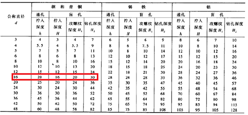 设计手册上提到的经验公式,其主要考虑的是材料的性能,即不同材料的螺纹损坏的难易程度不同,其备用的扣数不同。以M16螺钉为例,钢板通孔深度20,盲孔16。