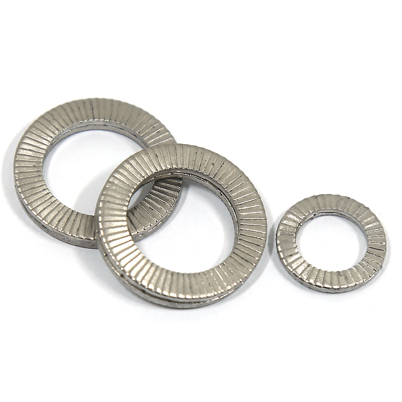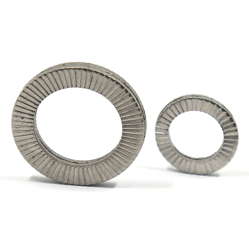 不锈双叠自锁垫圈DIN25201 防松动垫圈符合DIN25201标准,具有楔型制锁功能。两片垫圈大锯齿的角度大于螺栓螺纹的角度。另外,在垫圈的另一面有小型放射状锯齿。垫圈是大齿面相对的成对安装。