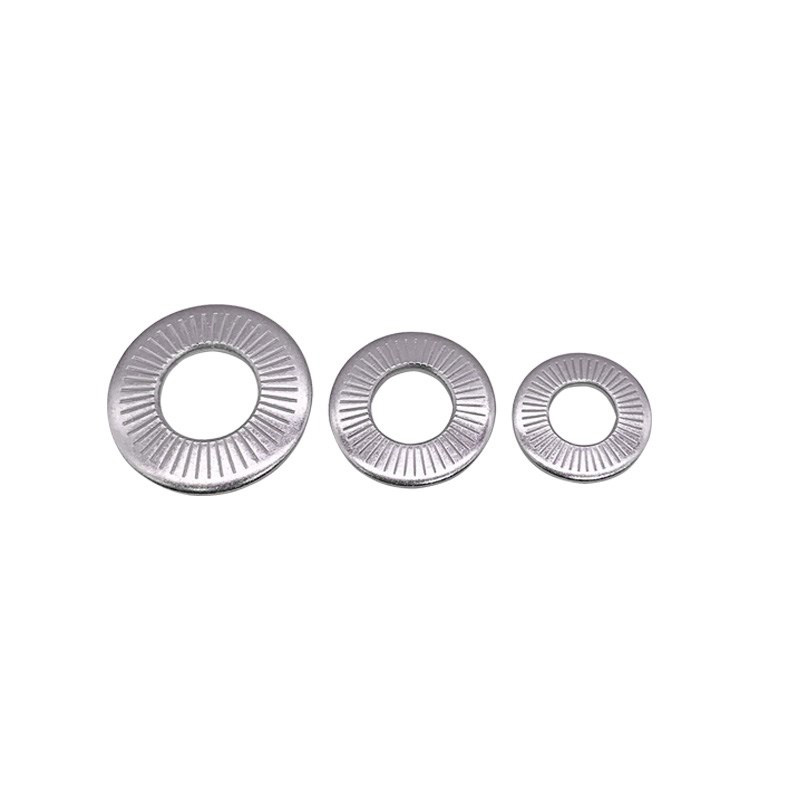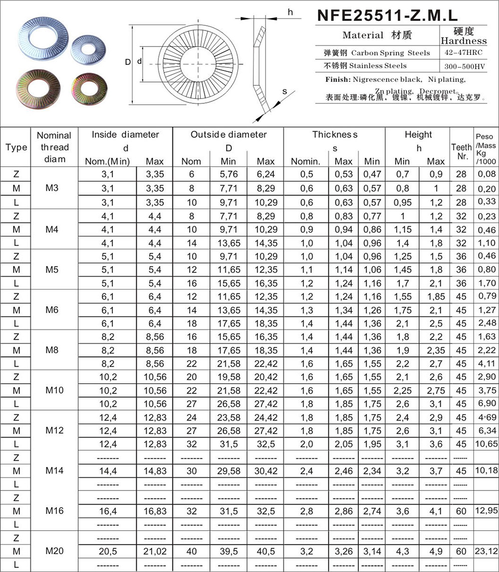 ![]() | 产品主要功能: 法式锁紧垫圈预紧力防松效果比碟形垫圈要好、在欧洲铁路工业及电气化设备领域已被大量使用和验证、表面增加了齿纹可以有效提高防松系数! 法式锁紧垫圈分标准型Z、加大型M、加宽型L、分别使用于头部较小或较大的螺栓、接触越大预紧力及锁紧效果越好! NFE25511法式垫圈制造工艺执行标准生产,规格:M3-M20为标准型号,也可根据客户需求订制,主要钢质:SUS304.316.A2.A4等,硬化等级:HV350,符合10级强度级别。 说明:不锈钢法式锁紧垫圈经硬化处理后会略有磁性、材质成份及盐雾都不会发生变化! |